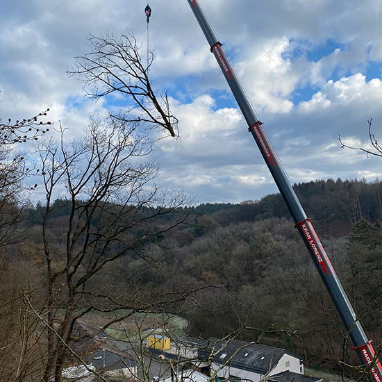 Manchmal sind Bäume nur sehr schwer zu erreichen oder bereits so geschädigt, dass herkömmliche Methoden an ihre Grenzen stoßen. Hier kommt dann zum Beispiel ein Autokran zum Einsatz, sodass Baumteile oder sogar ganze Bäume einfach über Hindernisse weg gehoben werden können. So Bleibt das Umfeld unberührt und unbeschadet. Auch wenn besonders viel Astwerk und Holz anfällt ist die Ausführung von Fällungen mittels Kran oft schneller und so mit effizienter.